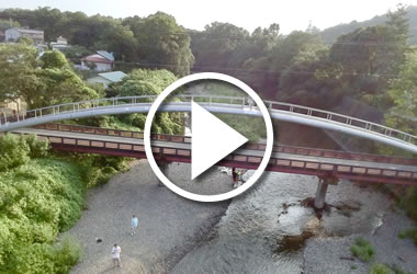 埼玉県の高麗神社の近くにある河川敷の風景。赤い橋に隣接するように大きなアーチ型の水道の橋が見えます。